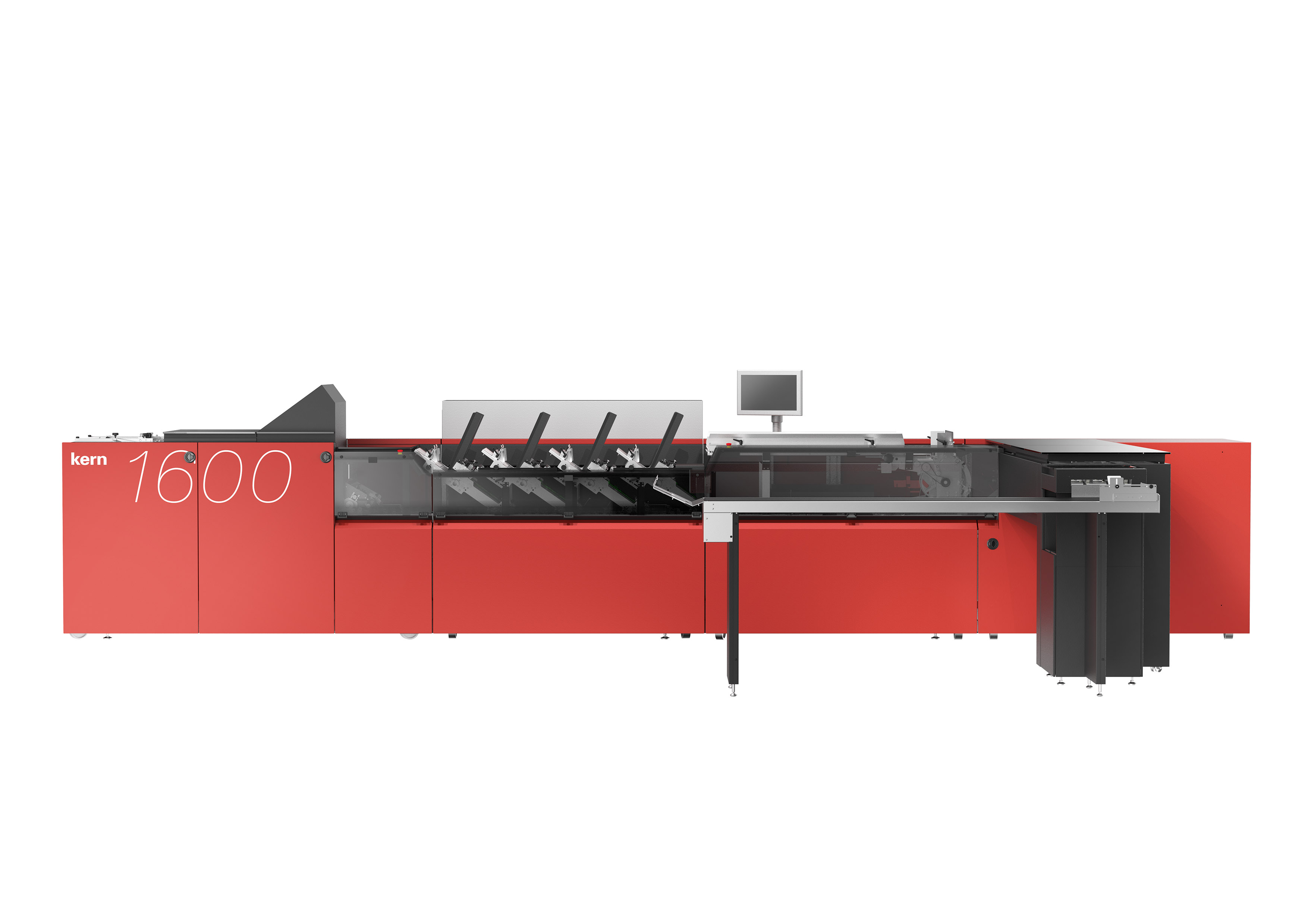 Den Angaben zufolge zeichnet sich die Kern 1600 durch schnelle Umstellvorgänge und eine «hohe Verfügbarkeit für neue Slots» aus. Über ein Einzelblatt-Modul können Dokumente für das Verarbeiten mit und ohne Falzapplikation zugeführt werden. Zwei standardmässige Gruppierstationen erlauben es, die Verpackungsgruppen vor und nach dem Falzen zu sammeln. Das Multiformat-Kuvertiersystem Kern 1600 ist mit einem Auslenkfach und einem Schuppenband ausgestattet.