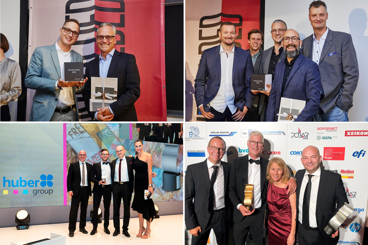 Zwei Druck-&-Medien-Awards gingen an die Akzidenzdruckerei B & K Offsetdruck GmbH (unten rechts). Einerseits wurde das Unternehmen in der Kategorie «Sozial engagiertes Druckereiunternehmen des Jahres» ausgezeichnet, andererseits erhielt der Geschäftsführer Jörn Kalbhenn die Auszeichnung als «Druckereimanager des Jahres». (jm)