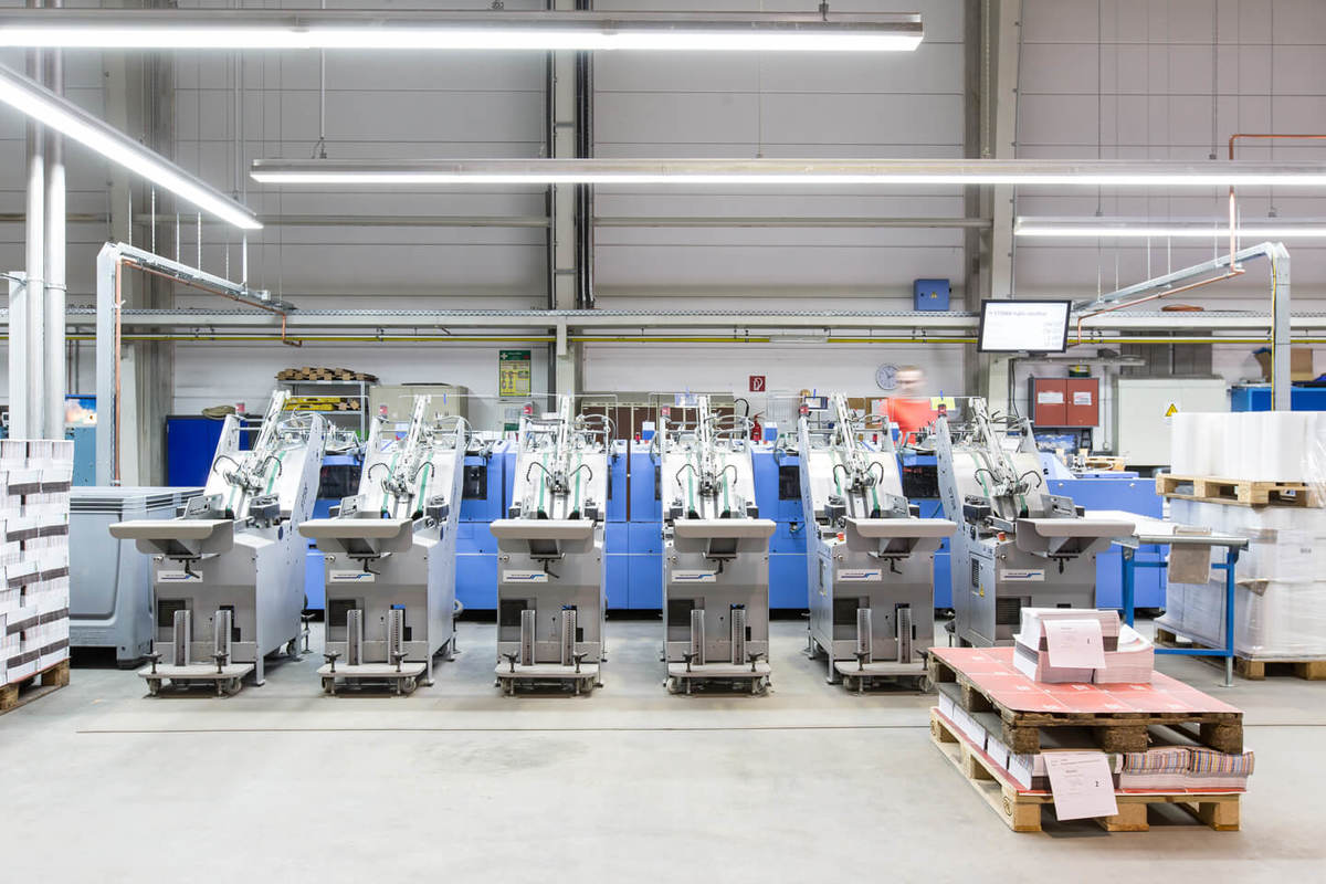 Der neue Pri­me­ra MC ist durch acht An­le­ge­sta­tio­nen, einen Wa­ren­kle­ber und einen Kreuz­le­ger Per­fet­to aus­ge­rüs­tet. Für die Buch­pro­duk­ti­on ar­bei­tet das Un­ter­neh­men zudem auf einem Pu­bli­ca S der Marke Kol­bus.