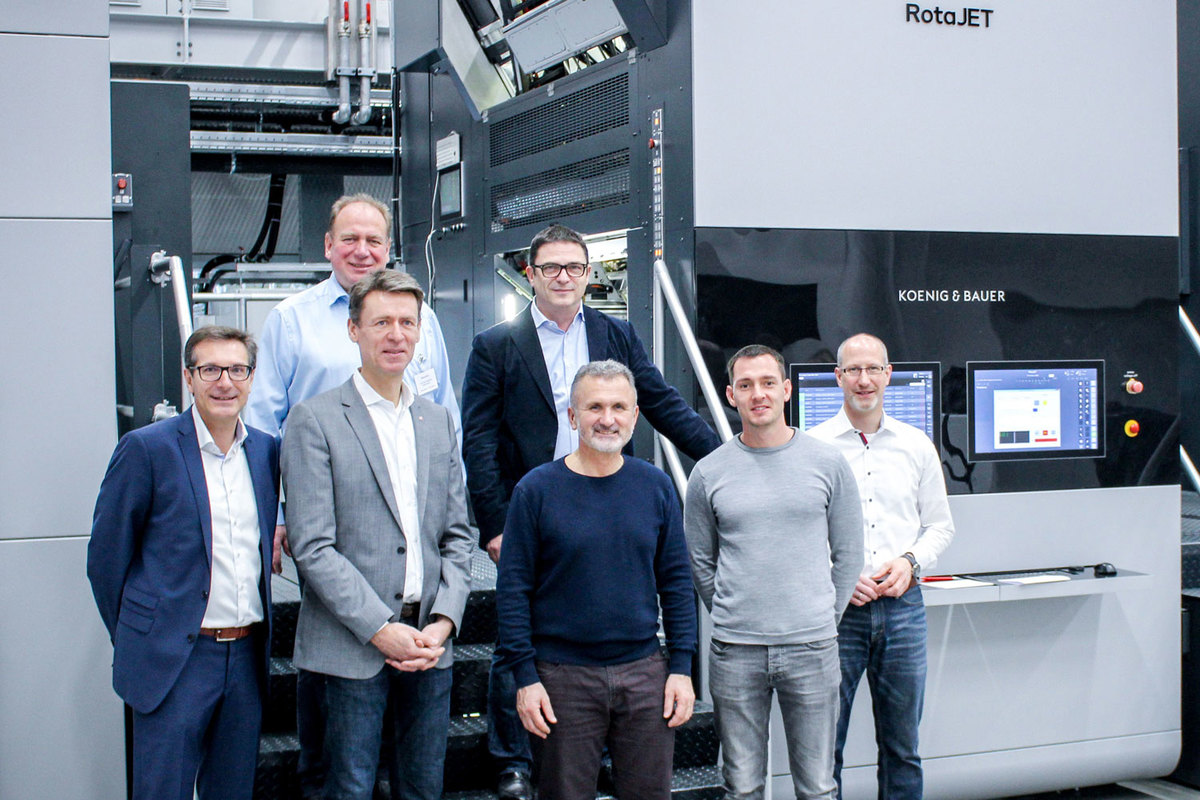 Delegationen von Swiss Krono Tex und Koenig & Bauer anlässlich eines Besuchs im Werk Würzburg von Koenig & Bauer. Hinten Ingo Lehnhoff (links), Geschäftsführer Swiss Krono Tex, mit Christoph Müller, Vorstandsmitglied Koenig & Bauer.