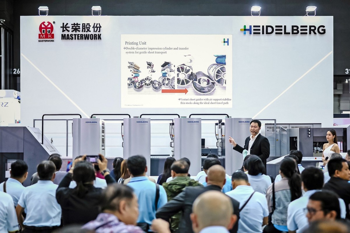 Anlässlich eines Packaging Day im Werk von Schanghai hat die Heidelberger Druckmaschinen AG (Heidelberg) Anfang September ihren Smart Print Shop für die Verpackungsproduktion vorgestellt. Der Workflow verlief von der Auftragsvorbereitung mittels Prinect, über den navigierten Druckprozess auf eine Speedmaster CD 102-8-L bis zum Stanzvorgang auf einer Promatrix 106 CS (Cutting and Stripping). Auf der Speedmaster CD 102 wurde mit der Multicolor-Technologie gearbeitet (Substitution von Sonderfarben durch CMYK plus Rot-Orange, Blau-Violett und Grün). Auf den Packaging Day in Schanghai folgte eine Open House bei Masterwork in Tianjin, jenem Heidelberg-Partner, der die Bogenstanzmaschinen und Heissprägefolienmaschinen baut. Schliesslich präsentierte Heidelberg auf der Pack Print International in Bangkok die Speedmaster CX 75 in einem neuen Design. Diese Bogenoffsetmaschine hat Heidelberg für Akzidenz- und für Verpackungsdrucker gebaut.