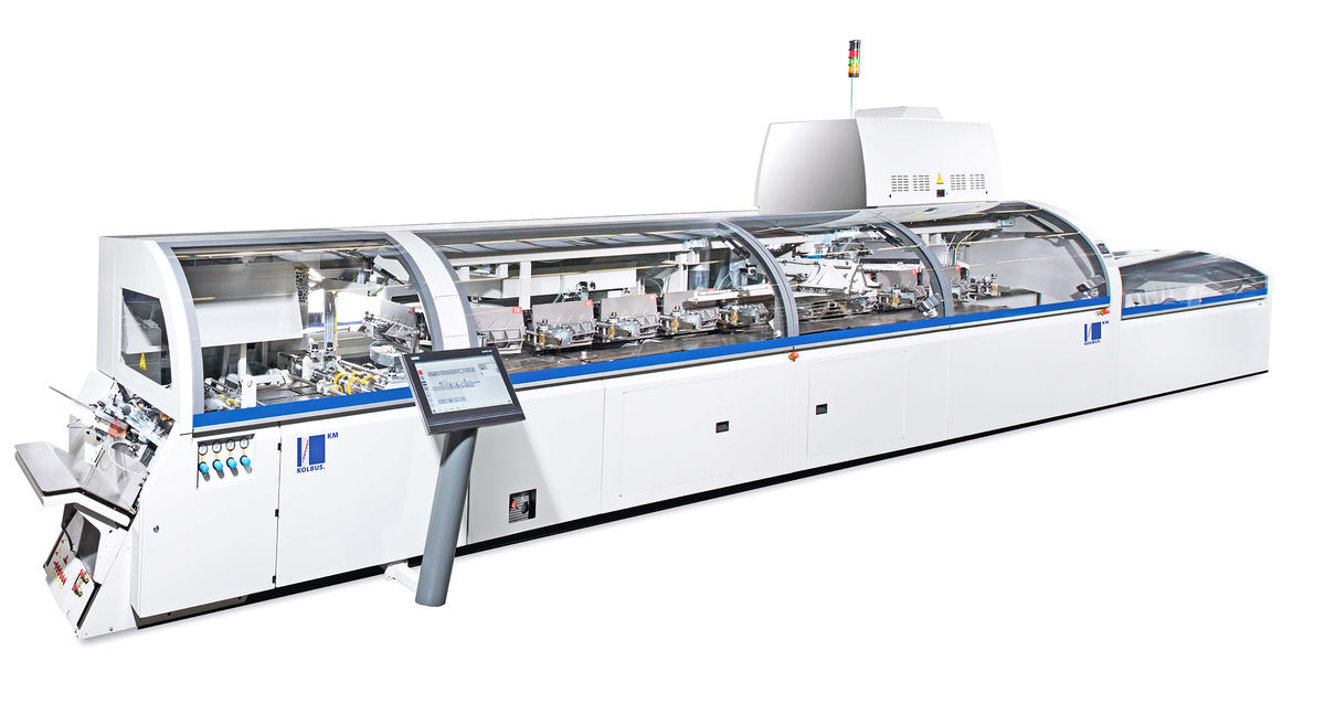 Auf dem neuen Klebebinder KM 610.A wird der Klebstoff im Two-Shot-Verfahren aufgetragen. Indem nach einem ersten Kaltleimauftrag Hotmelt- oder PUR-Klebstoff aufgetragen wird, könne die Klebstoffschicht vergleichsweise dünn gehalten werden, was ein gutes Layflat-Verhalten der Softcover-Bücher begünstige, erklärt Müller Martini.